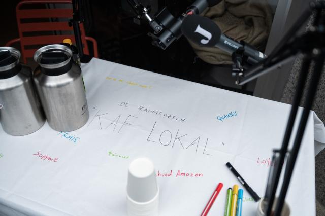 Ma net nëmmen dat. De Kaffisdësch vum Lëtzebuerger Journal ass en "Open Air" Podcast. E gëtt live op eisen Eventer opgeholl an ass esou och partizipativ. Wärend dem Owend hat jiddereen d'Méiglechkeet, Stéchwierder, déi hinnen zum Thema "Kaf lokal" an de Kapp komm sinn, op eise Kaffisdësch ze schreiwen. Dës Iddien a Froen huet de Maxime méi spéit am Gespréich mat afléisse gelooss.